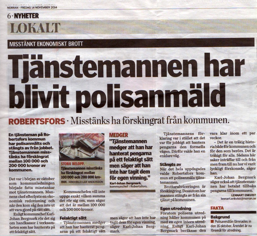 Norran har vågat rapportera om det tragiska fallet. På sju månader har inte Robertsfors kommun klarat att redovisa bidragen till föreningar. Hade detta tragiska fall av misstänkt ekonomiskt brott kunnat undvikas med bättre ledning i kommunen? När polisutredningen är klar hoppas vi kunna rapportera om utfallet.